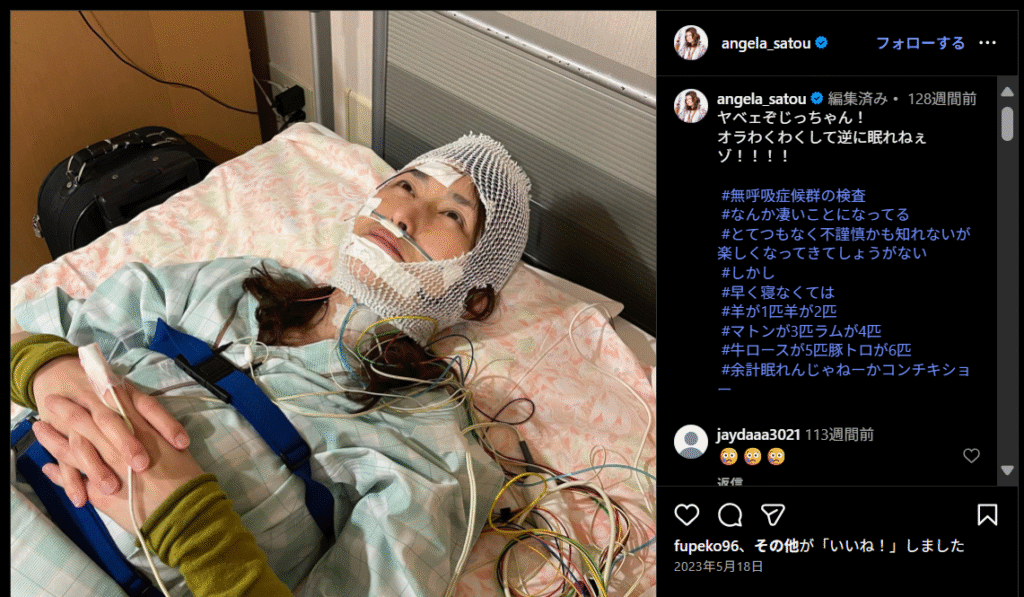 アンジェラ佐藤さんは、2023年5月に自身のInstagramを更新し、ベッドの上で多数のコードがつながれた写真を投稿しました。